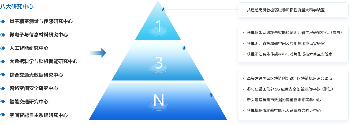 研究院着力打造“7+1+3+N”的创新载体体系,形成7大研究中心、1个国家级载体、3个省级载体以及若干个省市级各类载体。研究院打破学科壁垒,面向国家与产业战略需求,整合北航优势技术集群,目前初步形成“极弱磁量子精密测量与应用”“新型智能材料芯片与智能微系统”“工业大数据及机器人智能系统 ”“多维信息融合智能感知与无人系统”以及“主动健康与老龄健康关键技术及装备”“信息安全技术与保密通信装备”等6个具有北航特色的优势信息技术集群。