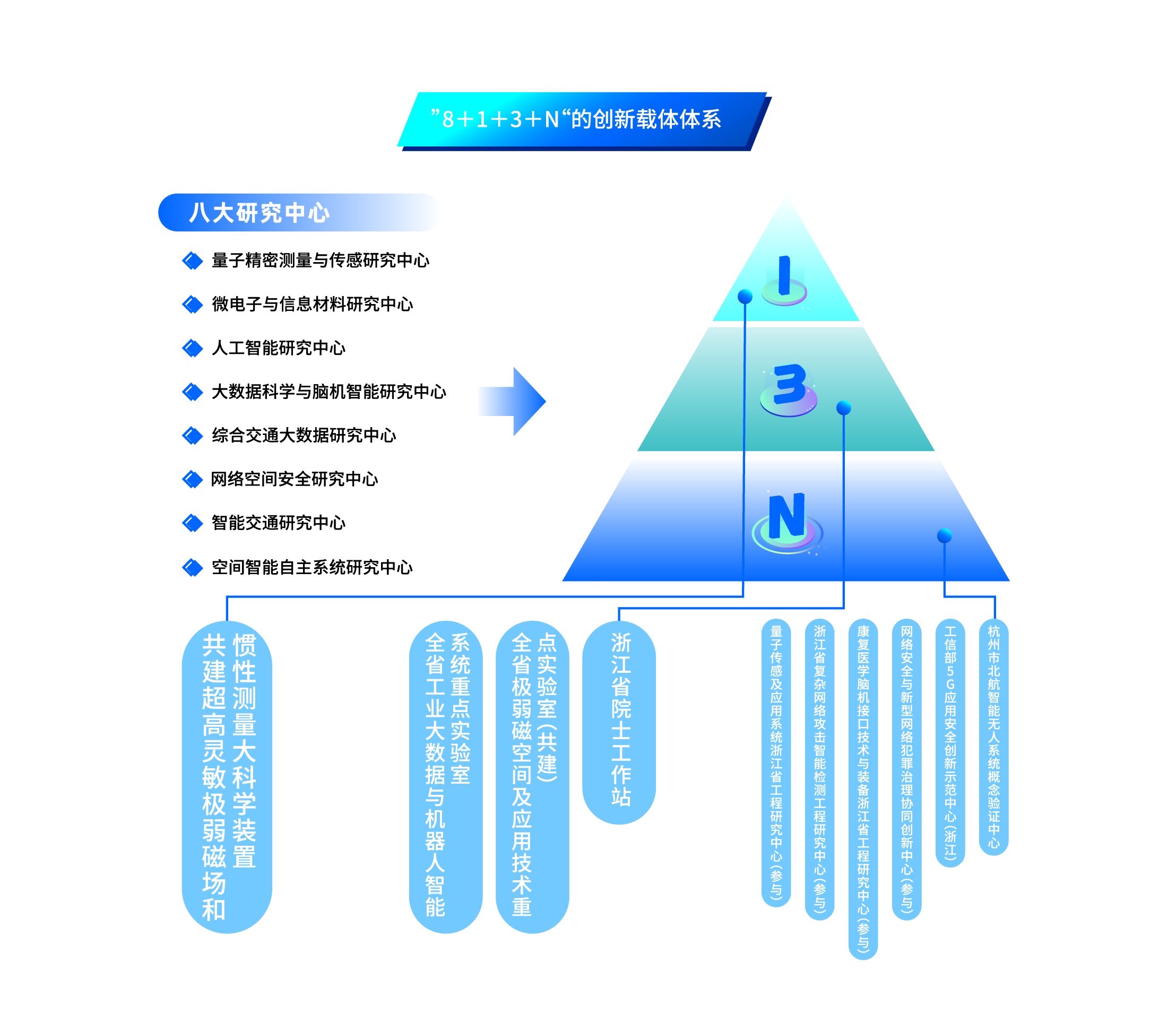 研究院着力打造“8+1+3+N”的创新载体体系,形成8大研究中心、1个国家级载体、3个省级载体以及若干个省市级各类载体。研究院打破学科壁垒,面向国家与产业战略需求,整合北航优势技术集群,探索“前沿技术+未来产业”一体化协同发展模式。培育了“十四五”期间浙江省唯一的国家重大科技基础设施;获批全省工业大数据与机器人智能系统重点实验室”、浙江省院士工作站等创新载体。